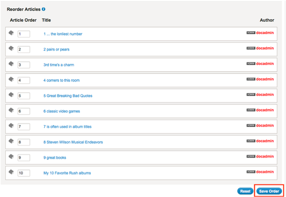 - Click and drag TKB articles up and down into the order you want them to appear on your community site. (Alternatively, you can enter the number in the Article Order column and click Enter on your keyboard.)