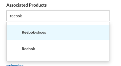 - Previously, when you searched for a product in the Associated Products field that had any special characters (other than numbers and alphabets) in its name, it did not return all the product names that matched the search keyword. For example, when you entered “reebok”, all the products association titles that matched with “reebok” showed up in the result set.
