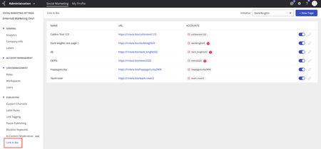 Release Notes & Updates 6 MIN READNow Available: Create and Manage Link in Bio Pages with Khoros MarketingDivyaVKhoros Alumni (Retired)2 years ago The Link in Bio section in the admin UI is visible only to users with either of the following roles: Users with Manage Accounts, Manage Company, and Full Access to Publish: Users with this rol...Show MoreUpdated 1 year agoVersion 5.0