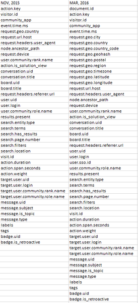 1) While we do not often add columns or change the order, it will happen on occasion. We disclose these changes in the Lithium release notes, but I also try to post the on the Bulk Data API TKB a few weeks before it happens. We strongly recommend that you not count on field order to map your data, but instead do the mapping by header name. The header names have never changed. So ingest the full file - preferably as a json file by adding "Accept: application/json". Then parse it on your side for the fields that you need. Or if you're using some sort of BI tool there should be some function like HLookup in Excel.