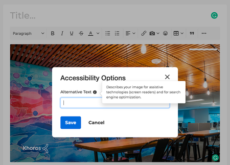Version 6.0Thanks for the response, MeghanaS! What about images we upload to blogs we post (the main image and images within the body)? Can we hide those from screen readers?