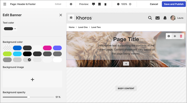Note: Background color and image are visible through transparent widgets. For example, in the screenshot below, an image was chosen for the overall Header, and the gray background color chosen for the Banner widget was set to 51% opacity. Therefore, the Header image is showing through the selected Banner color.