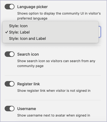 - Language picker: (for Localized Communities only) The drop-down menu that enables community members to switch between your enabled languages.