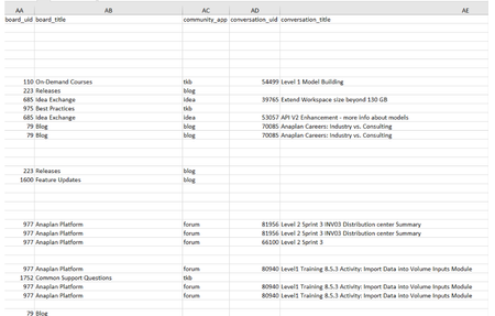 Question for the greater community as we've gone back and forth with Support/PS teams who don't seem to 'get' what we are asking, or we are horrendously bad at explaining this. When utilizing the bulk data API, can you truly retrieve details for 'Category' nodes? As we pull back data on our end, we get it for all nodes such as TKB, Blog, Forum, Ideas, etc, but we are not seeing anything come across for Category specific nodes nor the Community Homepage. They keep telling us to look at the ancestor path, but we don't want the path/node the article lives in, we want to literally see the visits to category pages since they make up a large portion of traffic. Does the Bulk data API actually provide results for Category nodes and/or the Community homepage itself? Edit: See image for example of data we're pulling - "Board_title" pulls back all 'board' nodes, while everything "blank" in board_title is things like member entrances, not anything to do with views/visits. Similarly, under the "community_app" field, there is no "category" option, just board options, while the 'blanks' option provides nothing of value to show us "Category" or "Community Homepage" on the site. x xx478Views3likes0CommentsLithiumVisitor decryption & bulk API visit id access