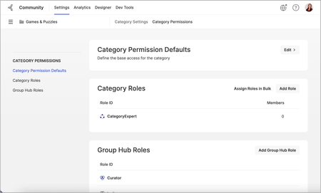 Categories are the highest-level containers within your community. Depending on the business purpose for your community, your categories might reflect lines of business, product lines, or other high-level divisions. If necessary, you can nest categories within higher-level ones or add boards to the top level of the community. As a rule of thumb, it’s best to start with a few high-level categories so that new visitors (and all visitors are new at this point) can find the boards they want quickly. In addition to one or more categories for your initial boards, you might also want to create a Welcome board where you post the rules of the community. As your community gains traction, you can build out additional categories and boards as needed. Again, your goal should be to keep the structure simple so that community members and visitors can find the content they want. You can also move boards and categories to other parts of your community. You can nest categories under existing ones if you need further divisions within a category. You can also move categories to another location after their initial creation. Category Permission Defaults Setting category permission defaults enables you to grant the base permissions for all community members who can access the category. To manage category permissions: Go to Settings > Structure and hover your cursor over the row with the category whose permission defaults you want to set. Click the gear icon and then click Edit. On the Category Settings page, click Category Permissions. In the Category Permission Defaults section, click Edit. (Optional) To jump to a specific permission to manage, enter it in the Find a permission field. Set Deny or Grant access for the settings in each area. Note: Each permission entry displays a description and recommended deny/grant status, as shown in this example: Related topics: About Community site structure Create a new role at the category level Permission descriptions285Views0likes0Comments