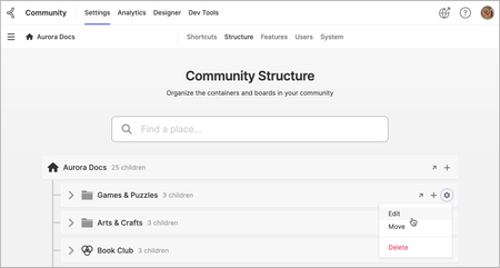 When managing your community structure (Settings > Community Structure), you may need to locate a specific container or board for your site so you can move it or edit its properties. To search for a container or board, enter the name of the place you want to locate in the Search bar and press Enter. After you’ve found the place you’re looking for, you can edit, move, and delete it as necessary by selecting an action from the Options menu: Related topics Move, reorder, edit, or delete Containers or Boards Container and Board permissions349Views0likes0CommentsAurora: About categories