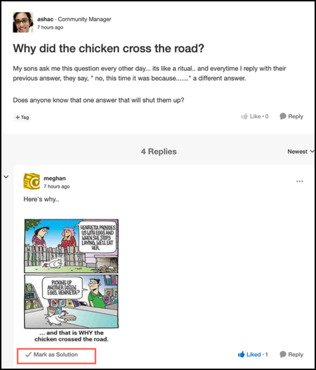 To use Accepted Solutions in discussions, you must enable them in your community. You can enable accepted solutions for the community as a whole or just for select categories or forums. Enable Accepted Solutions Go to the Settings at the level (community or lower-level place) where you want to enable accepted solutions. Tip: If Accepted Solutions is enabled at the community level, it is enabled for all lower-level forums. You don’t need to enable each one. If it’s turned off at the community level, you need to enable it for specific forums. Go to Features > Accepted Solutions. Turn on Accepted Solutions. When this setting is turned on, authors, admins, and moderators can mark a reply as a solution. The Mark as solution option is not visible to other members. Here’s how Mark as solution looks in a discussion: Manage Accepted Solutions permissions As an admin, you can manage the permissions for Accepted Solutions, Manage solutions. The permission is turned off by default to all community members except Administrators and Moderators. To manage the ability for community members to mark posts as accepted solutions: Note: To manage this permission at a lower level, go to the [Place] Permissions page and edit the permission defaults for that level. To manage this permission for a particular role, go to the [Place] Permissions page at the desired level of the community and edit the permissions of the individual roles. Go to the Roles and Permissions page for the community. Beside Community Permissions Defaults, click Edit. In the left column, click Accepted Solutions. Beside Manage solutions, select Deny or Grant as required. Unless you have specified different permissions for certain roles or levels below the community level (a category, group, or board), this selection affects all members of the community.201Views0likes0Comments