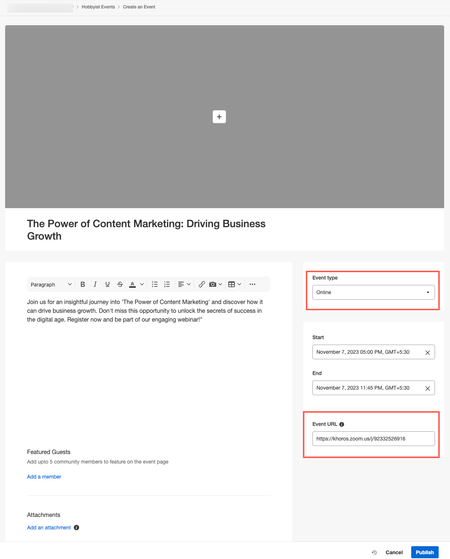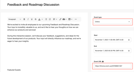 Events offers three types of events that enable members to connect and engage. With Online, In-person, and Hybrid events, you can ensure that every member in your community can participate in a way that suits their preferences and needs. Event type: Online To set an online event: Select Online from the Event type drop-down menu. The Event URL field appears. By default, we support YouTube, Facebook, and Vimeo videos as well as Zoom meetings and webinars. Enter the event's URL in the Event URL field. The published view indicates that it is an online event and also shows the preview of the event. Event Type: In-Person To set an In-person event: Select In-Person from the Event type drop-down menu. The Location field appears. Start entering the address and select from the suggestions. (Optional) Turn on the toggle if you want to display the location on Google Maps. The published view of the event shows that it is an In-person event along with the location of the event. Event type: Hybrid To set a Hybrid event: Select Hybrid from the Event type drop-down menu. An option to enter the location or address where the event will be held and an option to enter the URL of the event appear. Start entering the address and select from the suggestions. (Optional) Turn on the toggle if you want to display the location on Google Maps. Enter the URL for attendees to view either a livestream video (YouTube, Facebook. Vimeo videos) or join a Zoom meeting or webinar. The published view of a Hybrid event shows that it is a Hybrid event. It also shows the location where event will be held and a preview to the livestream videos or link to the Zoom meeting or webinar. Related Topics: About Events Creating an events node in community structure Create an event Events permissions and settings Integrate Zoom with Community Events499Views0likes3CommentsAurora: Internet Calendar Scheduling (ICS) file support for Events