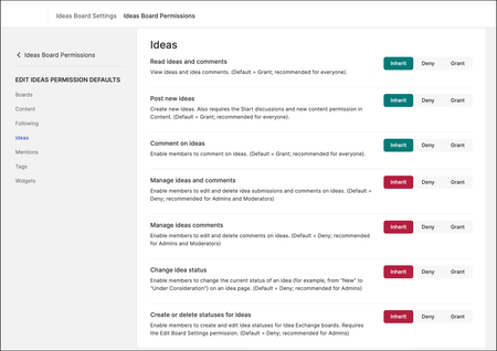 You can adjust permissions related to content at the community, container (category & group), and board level. Some permissions are set to Deny by default while others are set to Grant by default. At the container level and the board level, permission defaults and role permissions are inherited from the parent level. In those cases, the Inherit button is displayed in green to indicate that the permission was set to Grant at the parent level or red to indicate that the permission was set to Deny at the parent level. As an admin, you can manage these permissions. To manage content-related permission defaults at the community level: Note: To manage this permission at a lower level, go to the [Place] Permissions page and edit the permission defaults for that level. To manage this permission for a particular role, go to the [Place] Permissions page at the desired level of the community and edit the permissions of the individual roles. Go to the Roles and Permissions page for the community. Beside Community Permissions Defaults, select Edit. Review permissions in the following areas: Blogs Content Events Ideas Knowledge Bases Select Deny or Grant as required. Unless you have specified different permissions for certain roles or levels below the community level (a category, group, or board), these selections affect all members of the community. Content permissions While Forum permissions are granted by the Content permissions, Blogs, Event Boards, Ideas boards, and Knowledge Bases have distinct permission sections for content type-specific tasks. The Content permissions are provided for general content access and tasks and relate to all content types. Follow the links in the table below to learn more about the tasks granted by these permissions. Permission Default Related permissions in content type sections Read discussions and content Grant Blogs: Read posts and Read comments Ideas: Read ideas and comments Reply to discussions and content Grant Blogs: Comment on posts Events: Comment on events Ideas: Comment on ideas Knowledge Bases: Comment on articles Start discussions and new content Grant Blogs: Start new posts Events: Post new events Ideas: Post new ideas Knowledge Bases: Create, edit, publish, and manage articles Edit own posts Deny Blogs: Edit own published posts Events: Edit own events Ideas: Manage ideas and comments Knowledge Bases: Edit own published articles Edit any post Deny Blogs: Edit any published post Events: Edit all events Ideas: Manage ideas and comments Knowledge Bases: Edit any published article Move content Deny Blogs: Manage any posts and Manage own posts Delete own post Deny Blogs: Manage own posts Events: Delete own events Knowledge Bases: Delete own articles Delete any post Deny Blogs: Manage any posts Events: Delete all events Ideas: Manage ideas and comments Upload file attachments Deny Embed external content Grant Turn on link hyperlinking Grant Use simple HTML in posts Grant Use advanced HTML in posts Deny Use full HTML in posts Deny Make content read only Deny Post read-only content Deny Bypass moderation Deny Blogs: Bypass comment moderation Events: Bypass comment moderation Ideas: Bypass moderation Knowledge Bases: Bypass comment moderation Related topics: About Aurora Community site structure About Aurora Content Types235Views0likes0CommentsAurora: About idea statuses