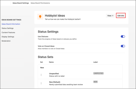 After a member submits an idea, an admin can review it and change its status by providing the appropriate feedback in the comment section. Note that the status updates are visible to all members in the community. Learn more about idea statuses. Admins and members with the Change idea status permission can update ideas’ statuses. Learn more about ideas permissions. Let’s take an example where you want to update an idea status from “New” to “In Review.” To update an idea’s status: 8 STEPS 1. From the Ideas board, go to Settings and click Update Status. 2. The Update Status window opens. 3. From the Status drop-down menu, select In Review. 4. Optionally, enter your feedback related to the status update. 5. Optionally, you can attach images. 6. Click Update. 7. A comment has been added to the idea indicating that the status has been changed along with your appropriate feedback. 8. That's it. You're done. Here's an interactive tutorial https://www.iorad.com/player/2251526/Update-an-Idea-s-status164Views0likes2CommentsAurora: Set Ideas permissions