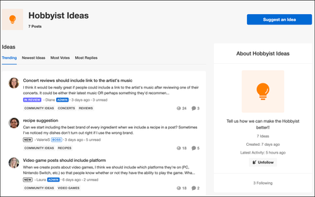 Your customers may have ideas about how to make your products better, from minor enhancements or a completely new feature. Khoros Ideas enables you to capture these customer ideas, let other members vote on these ideas, and share these ideas with your internal product teams. By enabling members to submit their own ideas, you are encouraging them to be thought partners with your company and stand out among their community peers. Submitted ideas are reviewed by your internal teams and assigned statuses (for example Under consideration, Accepted, or Declined) so everyone in the community can track the idea’s progress, vote on ideas they like, and even discuss the ideas by posting comments. What are ideas used for? Ideas provides members the opportunity to collaborate and innovate with your company. Ways you might use Ideas include: Product enhancements: solicit product suggestions and prioritize them based on real input from your customers. Conference panel and keynote topics: make sure your upcoming conference covers the material your customers are most interested in. Opinion polls: propose some suggestions and let community members vote for their favorites. In the community, all members can view ideas and vote on the ones they like. Here’s how an Ideas board looks: From the Ideas board, you can: Submit an idea Vote on an idea Search for an idea Follow/unfollow the Idea board Comment on ideas Members with the appropriate permissions (usually admins) can perform additional idea management tasks: Create an Ideas board Delete an Ideas board Set Ideas permissions Edit Ideas board settings Create, edit, and delete Idea statuses Update an idea’s status Move ideas Delete ideas Manage comments on ideas Block or allow comments Move a comment472Views0likes0Comments