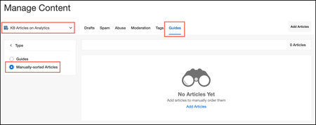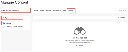 Use this method to create a structured Guide with Chapters and Articles inside the Chapters. Go to the Manage Content page. Select the knowledge base board where the widget was added. Select the Guides tab > Type > Guides. Select Add Guides. A window opens to add the guide. Enter a Title for the guide. Select Add. The guide is added. Open the Options menu (3 dots) near the title of the guide. Select Add Chapters. Enter a Title for the chapter. Select Add. Below is an example of two empty chapters in the guide. Select Add Articles (plus icon). Search for and add articles to the Chapters. You can refine your search by switching between Knowledge Base and Community. Here is an example of an article in a chapter: Add an article directly to a Guide Select Add Articles (plus icon). Search for and add articles to the guides. You can refine your search by switching between Knowledge Base and Community. In our example, we have added 2 chapters and an article to the guide we created: View the Guide Go to the knowledge base board in the community. You can see the manually-sorted articles on the knowledge base board. Select the title of the guide to open the guide on the page. You can see the guide with articles organized under chapters. Select the title of the chapters and articles displayed on the left panel to navigate through the guide. Related topics: About KB Guides Add Manually-sorted Guides Guides widget configuration General actions on KB Guides, Chapters, and Articles CRUD Action audit logs215Views0likes0CommentsAdd KB Guides with manually-sorted articles