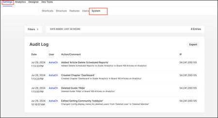 Administrators can have a comprehensive audit logging for all Create, Read, Update, and Delete (CRUD) actions on KB Guides. The following actions will be recorded in the audit log: Guides: Added, moved, deleted, and reordered Chapters: Added, moved, deleted, and reordered within/to Guides Articles: Added, moved, deleted, and reordered within/to chapters or Guides Additionally, audit logs will cover actions taken on Manually-sorted articles, including: Adding Articles Clearing the List Reordering Articles You can access the audit logs from Settings > System > Audit logs Related topics: About KB Guides Adding KB Guides Guides widget configuration General actions on KB Guides, Chapters, and Articles153Views0likes0Comments