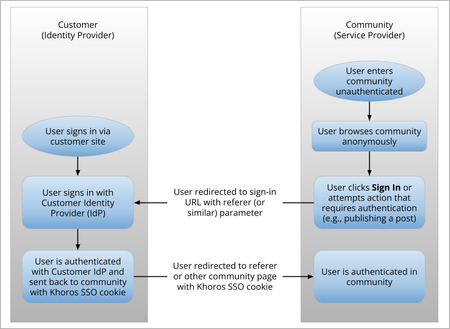 Khoros Single Sign-on (SSO) enables you to integrate your sign-in and registration system with your Khoros community member system. To create a seamless sign-in experience for community members, the Khoros SSO solution enables your user system to: Create a new member account in your community Sign in a member to the Khoros system Change a member's personal profile parameters in the Khoros system by assigning a role Change a member's permission levels in the Khoros system Members sign in as usual through your main site. After they sign in, they are forwarded to the Khoros site and are automatically signed in or registered in the Khoros system. To integrate with Khoros SSO, the client system must: Be able to create Khoros SSO tokens from its user system Have the Khoros SSO libraries installed Have a client-specific C encryption key installed SSO workflow diagrams Khoros supports cookie-based and parameter-based workflows. Cookie-based Khoros SSO Parameter-based Khoros SSO SSO Sign-Out Flow The flowchart below shows where members are directed upon sign-out. Khoros (Lithium) SSO libraries Khoros issues the Khoros SSO libraries (Java, .NET, or PHP) and a unique encryption key for each deployment. Information for all three versions is provided in the attached SSO Guide. Additionally, you can refer to the attached flowchart for a diagram that explains how SSO works with the Khoros Platform. Note: When using the .NET library, you must have the .NET Framework, not just .NET Core available for all requests to operate properly. Related topics: Khoros Aurora auto-sign in Configure SSO settings for the community1.2KViews3likes2CommentsAbout Aurora Analytics