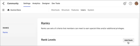 While Aurora communities provide some out-of-the-box ranks, you can also create your own to fit the needs of your community. To create a rank: Go to Admin > Settings > Users > Ranks. In the Rank Levels area, click Add Rank. On the Add Rank window, complete the following steps: Add a Name for the rank. (Optional) Enter a Description. Enter the desired Criteria for the rank (see Create a ranking formula). Note: Enter 1==1 in this field to create a newbie-style rank with no required criteria. (Optional) Enter any Roles granted to members who achieve this rank. Note: Administrator and Moderator roles cannot be granted via achieving a rank, so you cannot select these roles. (Optional) Enter any Roles removed from members who achieve this rank. Note: Administrator and Moderator roles cannot be removed via achieving a rank, so you cannot select these roles. In the Visual Style area, select a Label type: Text Only Outline Filled Select a color from the Label color drop-down menu. (Optional) In the Icon area, upload an icon from your machine to include beside the rank label. Only PNG and SVG images are supported. Note: Uploaded images are converted to 16 pixels in height and up to 100 pixels in width wherever they appear in the community (square images will be 16 px by 16 px). Your image will be scaled to fit the supported dimensions, so we don’t recommend using a really tall image as it will be difficult to see when it’s scaled to 16 pixels high. As described in the next step, you can see a preview of your rank image before saving. View the Preview of your design to verify that it looks the way you want it to. Click Add Rank. Back on the Ranks page, in the Rank Levels area, drag and drop the newly created rank to the desired position in the ranking structure. Ranks should be organized in order of how difficult they are to achieve. The most difficult ranks to achieve should be displayed at the top of the ranking structure on the Ranks page and have lower numbers (shown to the left of the rank) associated with them. The higher the rank level number is, the easier that rank is to achieve and the lower it is displayed in the ranking structure. For instance, 0 is the lowest rank level number in your ranking structure, but it is the hardest rank to achieve. When creating your ranks, keep this hierarchy in mind—that is, don’t put ranks in a random order or organize them alphabetically. If you don’t organize them by difficulty of achievement, they will not be awarded appropriately across the community. The rank is now available for use in the community. Members are evaluated against the ranking system each time they sign in to the community or shortly after they have met the criteria. At that point, they are awarded the rank. Related topics: About member Ranks and ranking formulas Create a ranking formula About default community ranks291Views0likes0CommentsAurora: Manage Ranks permissions