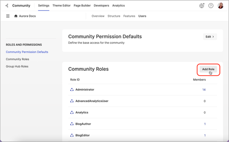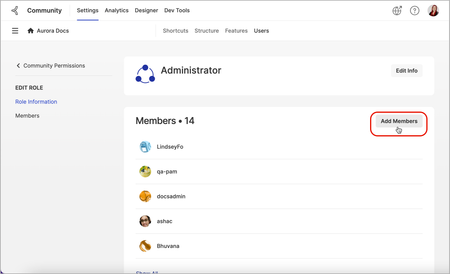 You can add community members to any of the default community roles or the roles you've manually created. A member's assigned role determines what they can and cannot do in the community. You can also assign roles to members from the Member Permissions page as described in Look up a member's roles and permissions. To add members to roles: Note: To add members to a role at a lower level, go to the [Place] Permissions page at the desired level of the community and then add members to the role. Sign in to Aurora as an Admin user and go to Settings > Users > Roles and Permissions. On the Community Roles and Permissions page, click Options menu of the role to which you want to add members and click Edit. On the Edit Role page, click Add Members. On the Add Members window, in the Members field, enter the name or the username of the member to whom you want to assign the role. In the drop-down menu, select the member. Repeat steps 4 and 5 to continue adding members. Note: To remove a member, click the X icon next to their username. Click Save. Note: You can manage the roles assigned to individual members from their member profile page. Learn more about managing member roles. Related topics: Import members from a CSV file418Views0likes0CommentsAurora: Best practices: roles and permissions
