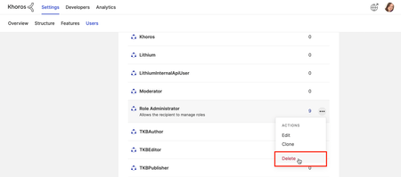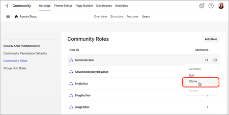 If you want to create a role that is nearly identical to a previously created role, you can clone the previously created role and its permissions, then change it as desired. You can perform this task at the community, category, group, or board level. To clone a role: Sign in to the community as an Admin user and go to Settings > Users > Roles and Permissions. On the Roles and Permissions page for the community, a category, a group, or a board, hover your cursor over the role you want to clone, then click the Options icon (ellipsis). In the Options menu, select Clone. On the Clone Role window, enter an ID. Note: The ID cannot be changed later. (Recommended) Enter a Description for the role. To copy the members from the previously created role to the cloned role, turn on the Also copy members option. Click Save. The Clone Role window closes, and the newly cloned role is displayed in the list on the Community Roles page. You now have the ability to clone or delete the role.173Views0likes0CommentsAurora: Delete a role