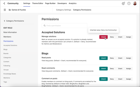 Each Khoros community permission enables users to perform specific actions. These permissions are assigned (either by default or manually) to different community roles. Permissions are grouped by feature area on the node where you’re assigning them: Accepted Solutions Analytics Badges Blogs Boards Case Portal Categories Community Content Escalations Events Following Groups Ideas Inbox Knowledge Bases Likes Media Member Management Member Profiles Mentions Moderation SEO Tags Widgets A description and a recommendation as to the type of member who should be granted this permission are displayed by each of the permissions so you know exactly what you’re granting and to whom. You can set permissions globally or at the node level (category or board) in the community structure. For each permission, you can keep the out-of-the-box default setting or explicitly Grant or Deny permissions as needed. About permission levels Manage community permission defaults About permission levels Permissions can be set to Inherit, Deny, Grant, or Assign. Inherit – Person has the permission defined in the node or node-level role above the current level. Therefore, this level does not display when you’re managing community permissions defaults but does display for the category, group, and board levels. You can hover your cursor over the Inherit button to see whether the inherited value is Deny or Grant (the button is also displayed as red for Deny and green for Grant). Deny – Person does not have the ability to take action described by the permission. Grant – Person has the ability to take action described by the permission. Assign – Person has the ability to take action described by the permission and has the ability to grant the permission to other members. Typically, this should be given only to Administrator roles. If you look at the Administrator role, you'll notice that all permissions are set to Assign since Admins can grant permissions to other users. As a general rule, only Admins should be able to Assign permissions to others. There are a few use cases where this could change, but typically speaking, Administrators should be the only ones that have the ability to manage permissions in the community. The different permission levels cascade down to any nodes below them, but certain permissions at higher nodes will override lower-node permissions: Assign Overrides any other permissions given at lower-level nodes Explicit Grant Overrides Default Deny, Explicit Deny, and Default Grant at lower-level nodes Explicit Deny Overrides Default Grant and Default Deny but not Explicit Grant at lower-level notes Default Grant Overrides Default Deny but not Explicit Deny at lower-level nodes Default Deny Does not override anything at lower-level nodes Note: If there are conflicts within roles, the explicit exists to override the default. So for example, if you set a permission to Assign at a particular level, all levels below that for that permission will be overridden even if they are set to Deny (including if you manually/explicitly set it to Deny). Note: It is a community management best practice to modify permissions at a role level rather than at a user level to ensure consistency across the community. Manage community permission defaults Setting community permission defaults enables you to grant the base permissions for all members of the community. To manage community permission defaults: Go to Settings > Roles and Permissions. In the Community Permission Defaults section, click Edit. (Optional) To jump to a specific permission to manage, enter it in the Find a permission field. Set Deny or Grant access for the settings in each area. Each permission entry displays a description and recommended deny/grant status, as shown in this example:741Views2likes5Comments