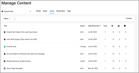 Community content filters identify inappropriate words used in community content and take appropriate actions on the content based on how you’ve configured the filters to behave. Any posts and replies, private messages, profile information, tags, and registration flow that are flagged by the content filters are sent to the Abuse tab, where you can periodically review and take actions on them. If you have been granted the appropriate permissions, you can view the content reported by content filters from the Abuse tab: The tab lists: Title: Title of the content reported by content filters Author: Member who created the content Date Reported: The date on which the content was reported Filter: The name of the content filter that reported the content Filter action: The filter action applied on the content. The filter actions can be Do not allow, Replace term, Check inline HTML and do not allow, and Take no action. Learn more about content filters. To review and filter reported content, view the below walkthrough: 10 STEPS 1. Sign in to the community as a Moderator. 2. Open the Account menu and go to Manage > Abuse. 3. From the Abuse tab, click Filters. 4. In Reported By, select Content Filter. 5. Now, you can view the list of content reported by content filters. 6. Using Actions, you can filter the content based on the content filter actions applied to them. Let's select Replaced. 7. Using Found In, you can filter based on content types. Let's select Blogs. 8. You can further filter the list based on Filter Name, Keyword, and Author. 9. The Abuse tab is updated based on the applied filters. 10. That's it. You're done. Here's an interactive tutorial https://www.iorad.com/player/2224500/Review-content-reported-by-content-filters Based on the content type and filter action, you can take these moderator actions: Content Type Filter Action Moderator actions on the content Forum discussions/Blog posts/Knowledge Base articles/Replies/Ideas/Events Replace term/None (Take no action) Edit Mark as Spam Confirm Abuse Ignore Report Ban Member Forum discussions/ Blog posts/Knowledge Base articles/Replies and Private Messages/Ideas/Events Blocked/HTML Blocked (Do not allow/Check Inline HTML and do not allow) Ignore Report Ban Member User Registration None (Take no action) Ignore Report Ban Member User Signups Blocked / HTML Blocked (Do not allow / Inline do not allow) Ignore Report Edit posts reported by content filters After reviewing the posts reported by content filters, you can edit the posts that are inappropriate and do not adhere to the community principles. While editing content, you must be careful not to modify the context of the content that the author of the post is trying to convey. To edit a post, open the Options menu on the post and click Edit. Mark posts reported by content filters as spam While reviewing the posts reported by content filters, you might find the content as spam. You can mark these posts as spam. After you mark the post as spam, the post is removed from the community and moved to the Spam management tab. Learn more about Spam management. From the Abuse tab, you can mark reported posts as spam in these ways: Open the Options menu on the post and click Mark as Spam. Click the post from the list to review and Mark as spam. Confirm posts reported by content filters as abuse After reviewing the reported posts, you can confirm them as abusive messages. When you confirm the abuse, the posts are removed from the community and this list, and are moved to the Moderation tab in the Rejected filter where moderators can review and take necessary actions. From the Abuse tab, you can confirm abuse in these ways: Open the Options menu and click Confirm Abuse. Click the post from the list to review and Confirm Abuse. Ignore content reported by content filters From the Abuse tab, you can ignore the content reported by content filters after reviewing them so that you or other moderators do not re-evaluate them. When you ignore a report, the content is removed from this list. From the Abuse tab, you can ignore a report in these ways: Open the Options menu and click Ignore Report Click the content from the list to review and Ignore. Ban members from the Community After reviewing the reported content, you can ban members who are abusive in nature. This helps to avoid malicious behaviors across the community. Learn more about banning members from the community. From the Abuse tab, you can ban members abuse in these ways: Open the Options menu and click Ban member. Click the post to review and Ban Member.912Views0likes2CommentsAbout Aurora Communities spam management