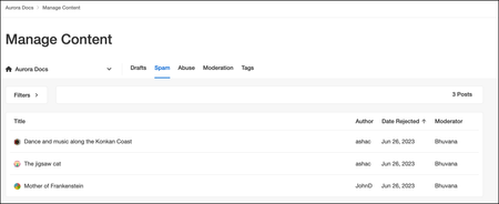 Managing spam in your community is integral part of keeping it safe and relevant for your members. The Manage Content page Spam management tab lists content that has been identified as spam. From this page, you can manage content marked as spam and take a variety of actions on this content. We recommend monitoring this page daily. To assist with effectively managing posts that have been marked as spam, we also recommend you select Hide from View for posts that have been reviewed and confirmed as spam. They can still be found by author or keywords in the Filters section of the Manage Content page. If you have been granted the appropriate permissions, you can access the Spam management page via Manage Content dashboard as shown here: The page lists: Title: titles of posts marked as spam Author: authors of posts marked as spam Date Rejected: the date on which posts were rejected as spam; you can sort the list based on this column Moderator: the member who reported the spam Note: Spam is removed from this view after 30 days, but you can still find it by searching. Manage spam On the Spam management tab, you can perform these actions: Review posts captured as spam Search and filter the content that are marked as spam Hide reviewed spam posts from the Spam management list. Tip: Hiding posts from the spam lists prevents you from re-evaluating them multiple times. You can still find these hidden posts if you search them in the Spam management tab. Recover a post mistakenly marked as spam Sort the spam posts in the ascending/descending order of post creation date by clicking Date Reported in the column header528Views0likes0CommentsAurora: Enable spam management