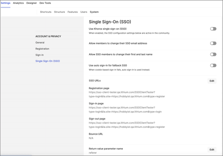 Before you can use SSO with your community, you need to configure settings and enable the option. Note: As soon as you turn on the Use Khoros single sign-on (SSO) option, all the settings in the Single Sign-On area become active in the community. To configure SSO settings and enable SSO: Go to System > Account & Privacy. Scroll down to the Single Sign-On (SSO) section. Manage the following options: Allow member to change their SSO email address: Enable members using SSO to change the email associated with their account. This should be enabled only if the email address is collected on the Community SSO Registration screen. Allow member to change their first name and last name: Enable SSO users to update their first and last names under My Preferences > Personal. Use auto sign-in for fallback SSO: When Khoros SSO token-based sign-in fails, auto sign-in is used instead. Enter the following SSO URLs: Registration page: Direct users to this URL when they register. Sign-in page: Direct members to this URL when they sign in. Sign-out page: Direct members to this URL when they sign out. Bounce URL: (Optional) URL where the first request of a session is redirected. Can help to enable seamless Community authentication or "Bounce SSO". Leave blank to disable. Enter the Return value parameter name. By default, the Aurora Community application appends a query string parameter named referer (spelled as shown) and a value corresponding to the URL of the page the member was browsing prior to being redirected to the login or registration page. If your authentication system is already configured to use a parameter like “referer,” you can change “referer” to the name of that parameter. Otherwise, leave the parameter name as “referer.” Turn on Use Khoros single sign-on (SSO) to make these settings active in the community. Note: This must be enabled in order for any configured SSO mechanisms to be fully functional, including when using the multi-auth Sign-in Display feature detailed in Multi-Auth SSO. URL formats SAML (REDIRECT BINDING) Sign-in URL: <Aurora url>/t5/s/<communityID>/auth/saml/doauth/redirect Sign-out URL: <Aurora url>/t5/s/<communityID>/auth/saml/dologout/redirect SAML (POST BINDING) Sign-in URL: <Aurora url>/t5/s/<communityID>/auth/saml/doauth/post Sign-out URL: <Aurora url>/t5/s/<communityID>/auth/saml/dologout/post OIDC SSO Sign-in URL: <Aurora url>/t5/s/<communityID>/v1/auth/oidcss/sso_login_redirect/provider/<providerID> Sign-out URL: <Aurora url>/t5/s/<communityID>/v1/auth/oidcss/sso_logout_redirect/provider/<providerID> Related topics: About Khoros Aurora Single Sign-On (SSO) Khoros Aurora SSO auto-sign in MultiAuth SSO632Views0likes0CommentsAurora: Multi-Auth SSO