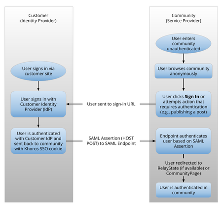 Single-Sign On (SSO) eliminates the need for users to provide their login credentials each time they sign in to different applications and services. With SSO, users can sign in once, and those same credentials can be reused to sign in to other applications or services. SAML enables Single-Sign On. Learn more about Khoros Single Sign-On. SAML SSO Supported SAML 2.0 profiles Supported flows Existing customers who want to upgrade to Aurora and port their existing SAML configuration may want to contact their Customer Success Manager or Account Executive. This process can be involved, and a Professional Services (PS) engagement can ensure a successful reconfiguration and help address any existing customizations such as user authentication workflows, custom user profile fields, and other customizations or integrations relying on user data. About Khoros SAML SSO Let’s begin by defining some terms in the context of the Khoros Aurora platform: IdP (Identity Provider): This is your SSO server. IdP is a server or service that provides the end-user identity authentication and SAML assertion. The IdP is owned and managed by you (the customer). SP (Service Provider): This is your Khoros community. SP is a software/service platform that consumes/processes the assertions SAML provides. Security Assertion Markup Language (SAML) is an OASIS standard for passing single sign-on (SSO) authentication data from an identity provider to a service provider. This XML-based protocol uses security tokens containing assertions to pass information about an end user between the SAML Identity Provider (IdP) and SAML Service Provider (SP). Here's an overview of the SAML SSO workflow: SAML implements a secure method of passing user authentications and authorizations between the identity provider and service providers—in our case, your community. When a user signs in to a SAML-enabled community, the community (the SP) requests authorization from the appropriate identity provider. The identity provider authenticates the community member’s credentials, then returns the authorization for the member to the community, and the member is signed in to the community. Supported SAML 2.0 profiles We support the following SSO profiles used to define the assertions, protocols, and bindings that support your integration: Web Browser SSO Profile, involving an identity provider (IdP), a service provider (SP), and a user employing an HTTP user agent (usually a web browser). Single Logout Profile in conjunction with the HTTP Redirect binding (no backchannel communication) Khoros supports HTTP POST and HTTP Redirect SAML 2.0 bindings, which map SAML protocols to other messaging and communication protocols. Supported flows Khoros supports the following two flows for SAML: SP-initiated SAML IdP-initiated SAML Read on to learn how community admins can configure SAML SSO for their community by themselves. Related topics: Configure SAML for the Aurora community About SAML settings367Views1like0Comments